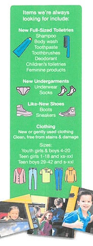 You can donate new or gently used clothing, new undergarments or full size toiletries at our Methuen Office – 421 Merrimack Street, Suite 203 Methuen, MA 01844