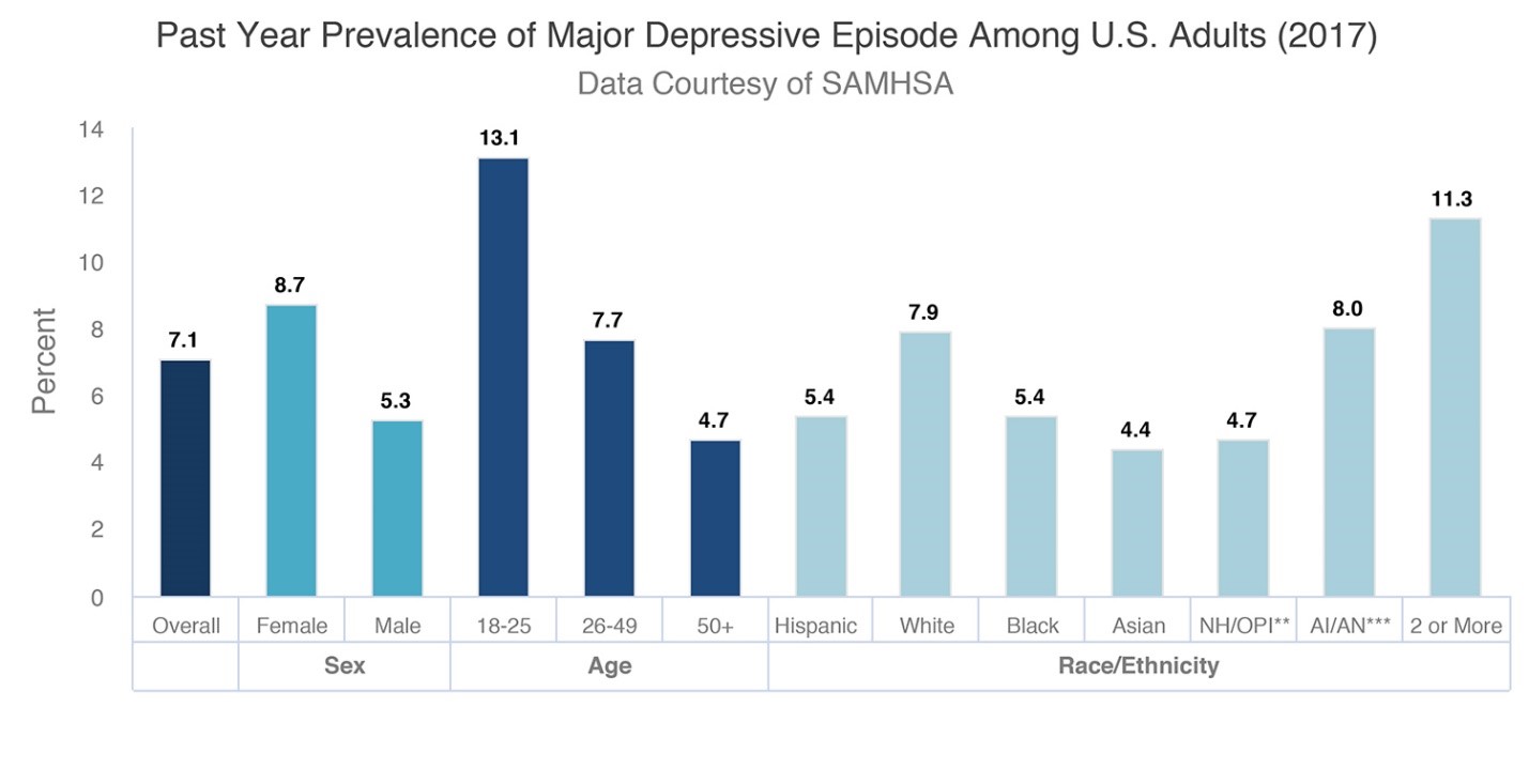 Below is a chart of the percentage of U.S. Adults who have dealt with depression in 2017. The variables range from gender, age, race/ethnicity. Based on the results, most of the people experiencing this major depressive episode were in the 18-25 age range and were identified females. This is not to say that people of other age groups or identified genders are not affected just as much.