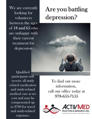 If you or someone you love is struggling with depression and not happy with current treatment, ActivMed is currently enrolling in studies for those seeking new treatment options. Study participants who qualify are closely evaluated by a board-certified physician and research staff. Reimbursement is also available for travel in the form of travel stipends. To learn more and see how you or someone you love may qualify for a study, click HERE.