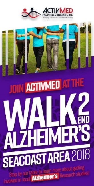 Alzheimer’s disease accounts for 60 to 80 percent of all dementia cases. Come join the ActivMed team as we take the part in both the 2018 Walk to End Alzheimer’s in Andover, MA on September 16, 2018 at the Andover Landing at Brickstone Square, and the Seacoast Area Walk to End Alzheimer’s on September 23, 2018 at the Little Harbour School in Portsmouth, NH. Stop by our table and learn about getting involved in the fight to end Alzheimer’s!