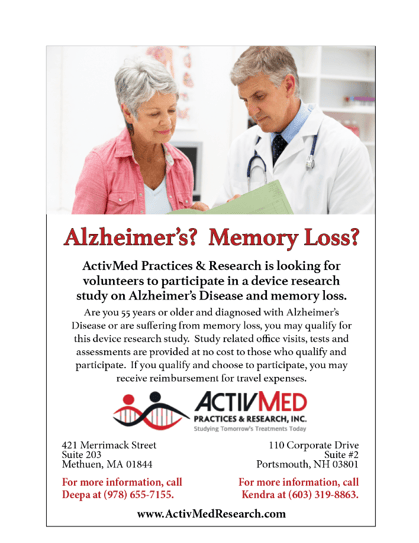 Participating in fundraising events is only part of the journey to finding a cure. Volunteers are needed more than ever to help find new treatments and ultimately a cure. ActivMed is currently looking for volunteers to participate in a device research study for Alzheimer’s disease and memory loss at our Methuen, MA and Portsmouth, NH locations. Study-related office visits, tests, and assessments are provided at no cost to those who qualify and participate. Reimbursement for travel expenses is also available for qualified participants.